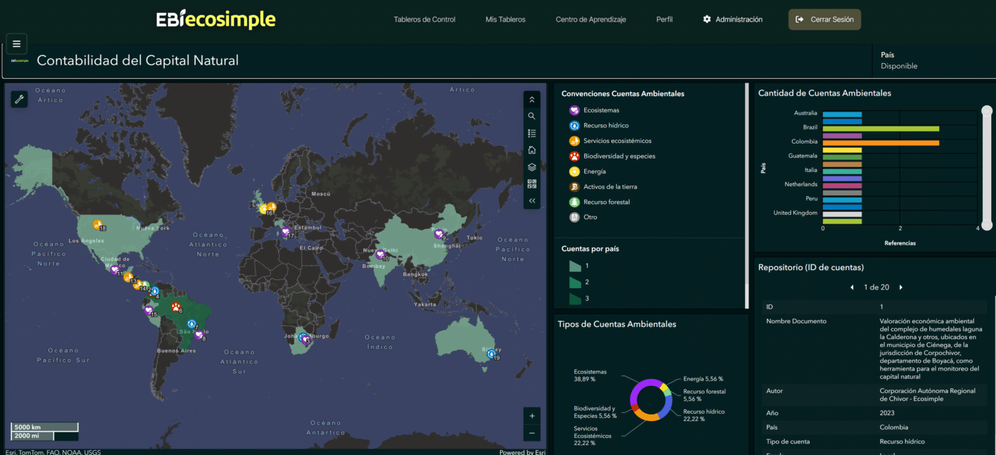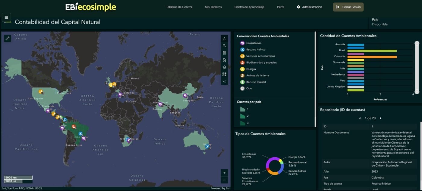 Como parte de este proceso de fortalecimiento, Ecosimple pone a disposición, a través de EBI–Ecosimple, un tablero de contabilidad del capital natural que consolida información pública y técnica sobre países que han desarrollado cuentas ambientales de recursos naturales.